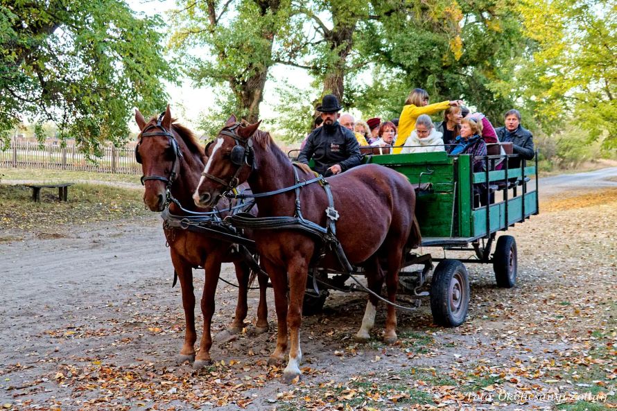 A csárda előtt lovaskocsira szálltunk, Csöpi és Tulipán, a két tapasztalt lipicai paripát Krisztián hajtja a hepehupás földúton a Puszta Kapuja Információs Központhoz.