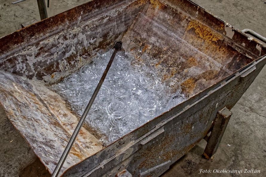 Következtek az utómunkák, a kész poharak ellenőrzésétől a csomagolásig. Itt álljunk meg a pillanatra, mit is jelent az ellenőrzés? Egy nagy pontosságú tolómérővel, sublerrel megmérik a poharak, kelyhek külső méreteit az előírt helyeken, pl. egy talpas pohárnál a felső szél, a talp és a szár méretei kizárólag plusz-mínusz 1 mm-rel térhet el.