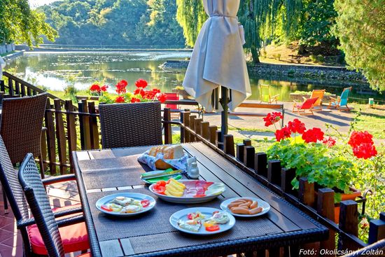 A reggeli rusztikusan elegáns tálalásban érkezik, a helyi vágóhídról származó sonkával, kolbásszal, mártogatósokkal, többféle friss kenyérrel, kiflivel. A házi lekvárok, és sajtok mellett tortatálakon kínált édességek csábítanak szokatlan mennyiségben, a padlizsánkrém, a körözött, a bundás kenyér, meg a tejbegríz csak ráadás.